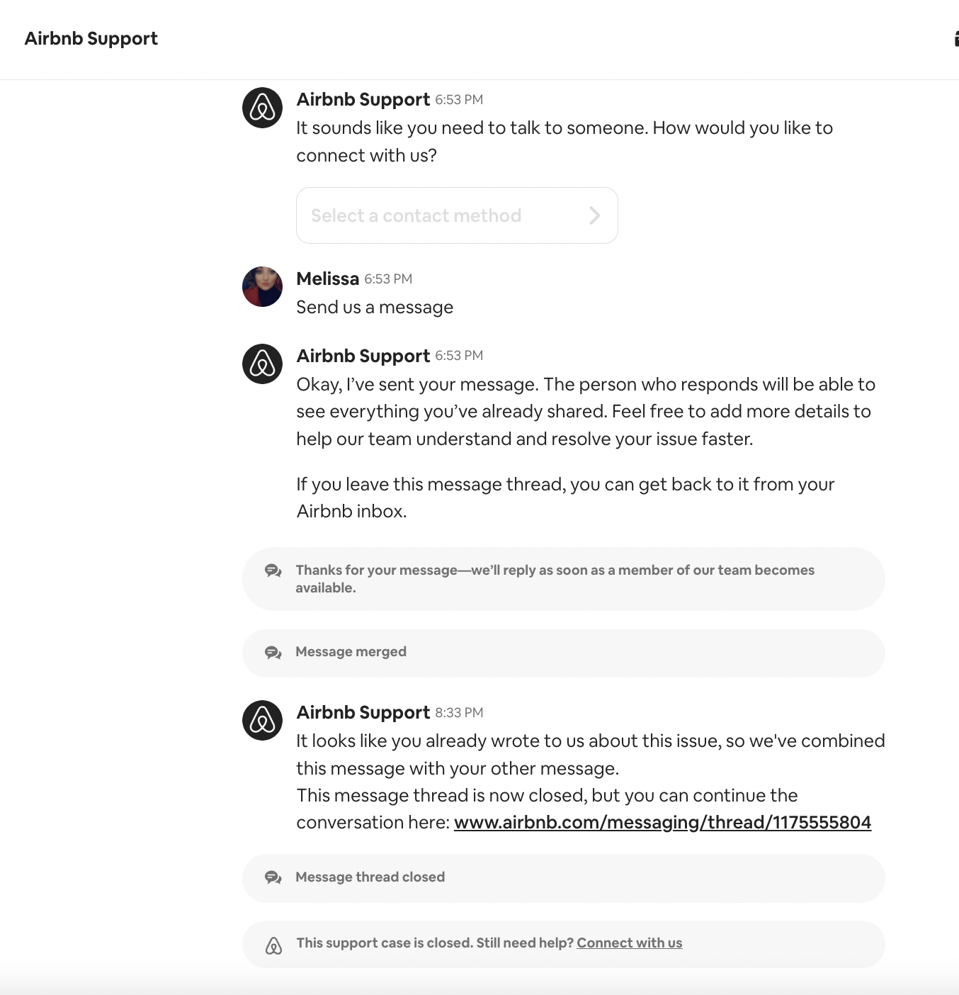 (this message below was sent to Airbnb on May 16) .. and shortly after, they closed the message and merged it back to the original ambassador who hasn’t been replying in days!