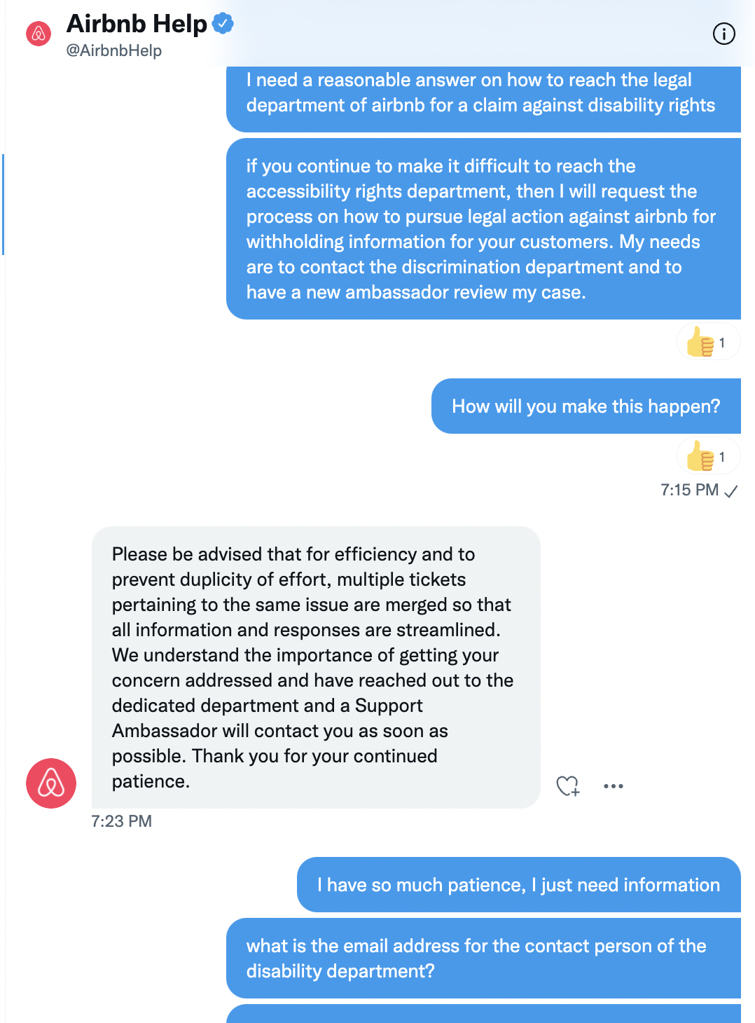 This has been a difficult life experience to handle these personal problems that directly affect my disability rights issue and have no resolution or empathy from Airbnb. I am dissatisfied that this has taken such a long time from a support ticket that has been claimed as “escalated to the highest department.”