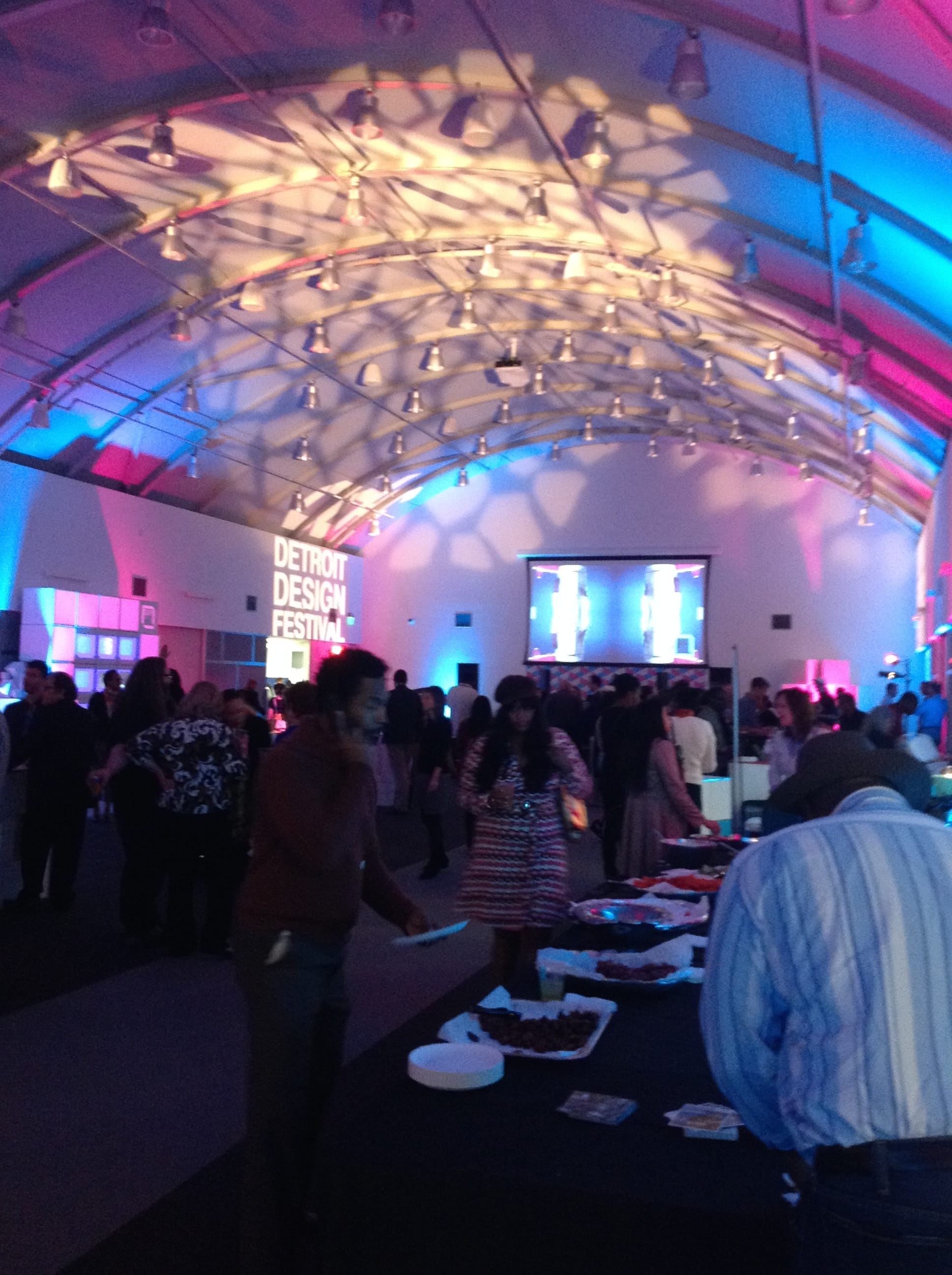 Detroit Design Festival opened its door with a kickoff party at College for Creative Studies. This design festival featured special exhibits, student shows, interactive design experiences, music and dancing. There were custom graphic designs projected onto white boxes near the walls. Many of these designers spent a lot of time creating these videos to move with special effects and transitions.