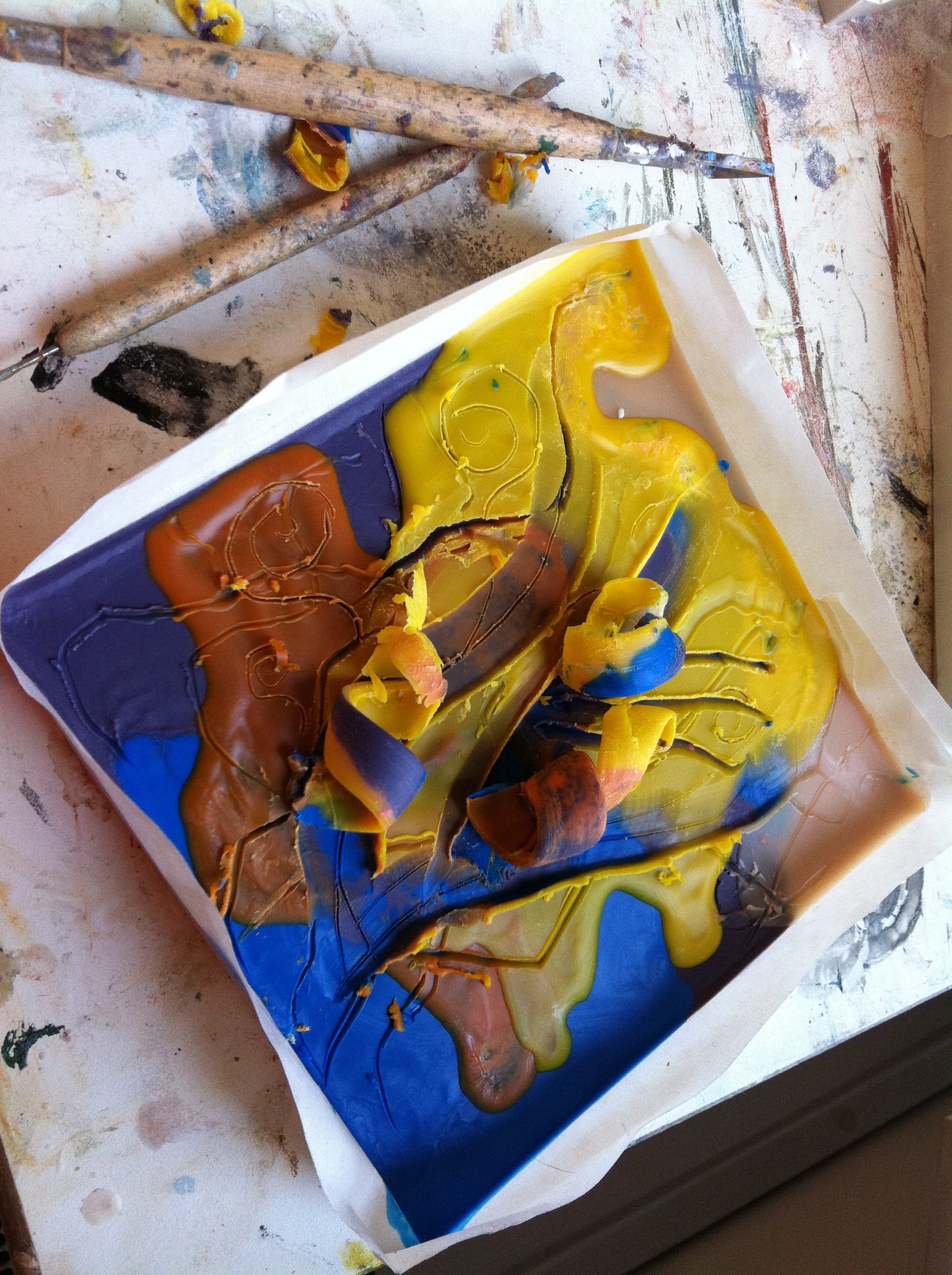 The wax painting is created with bee wax and color pigments heated to a liquid form. Pour the liquid on the palette. The liquid form becomes a soft seal and hardens over time.