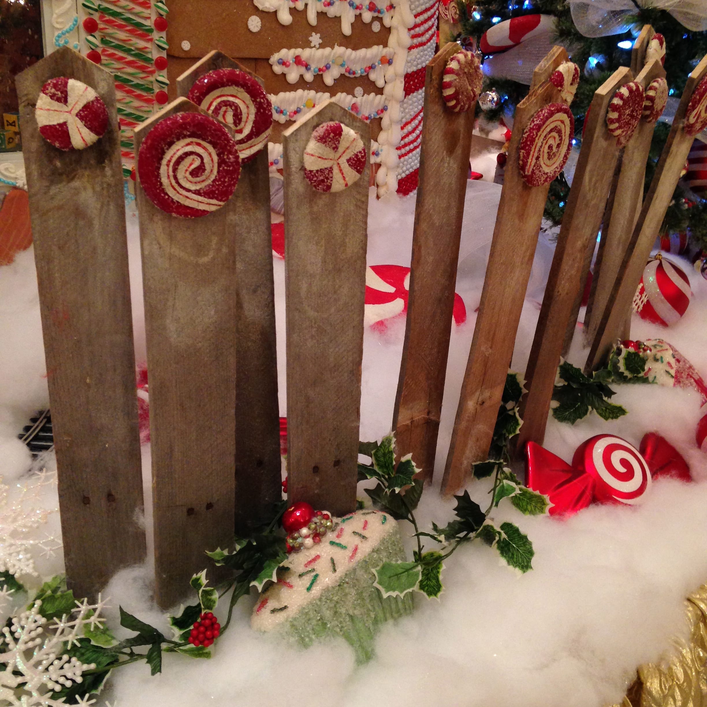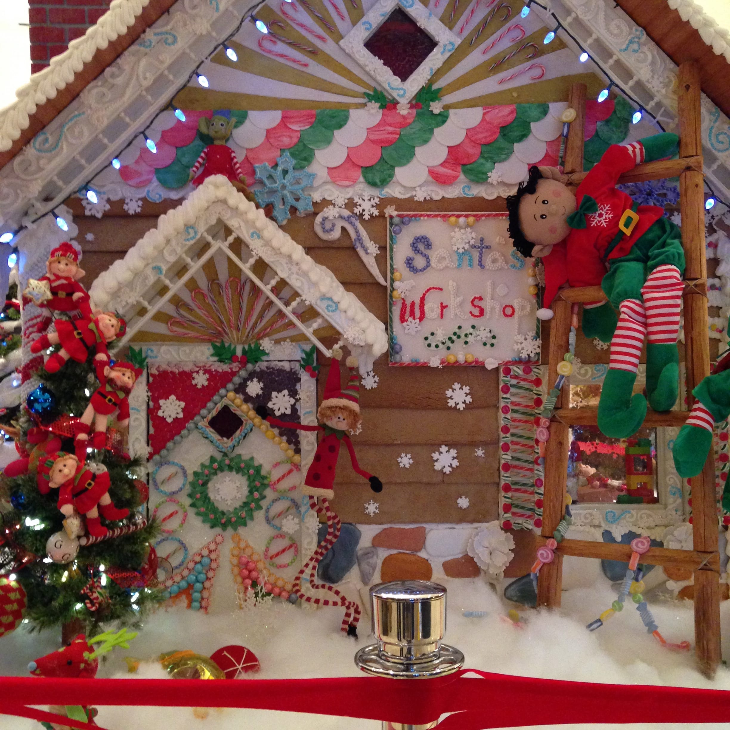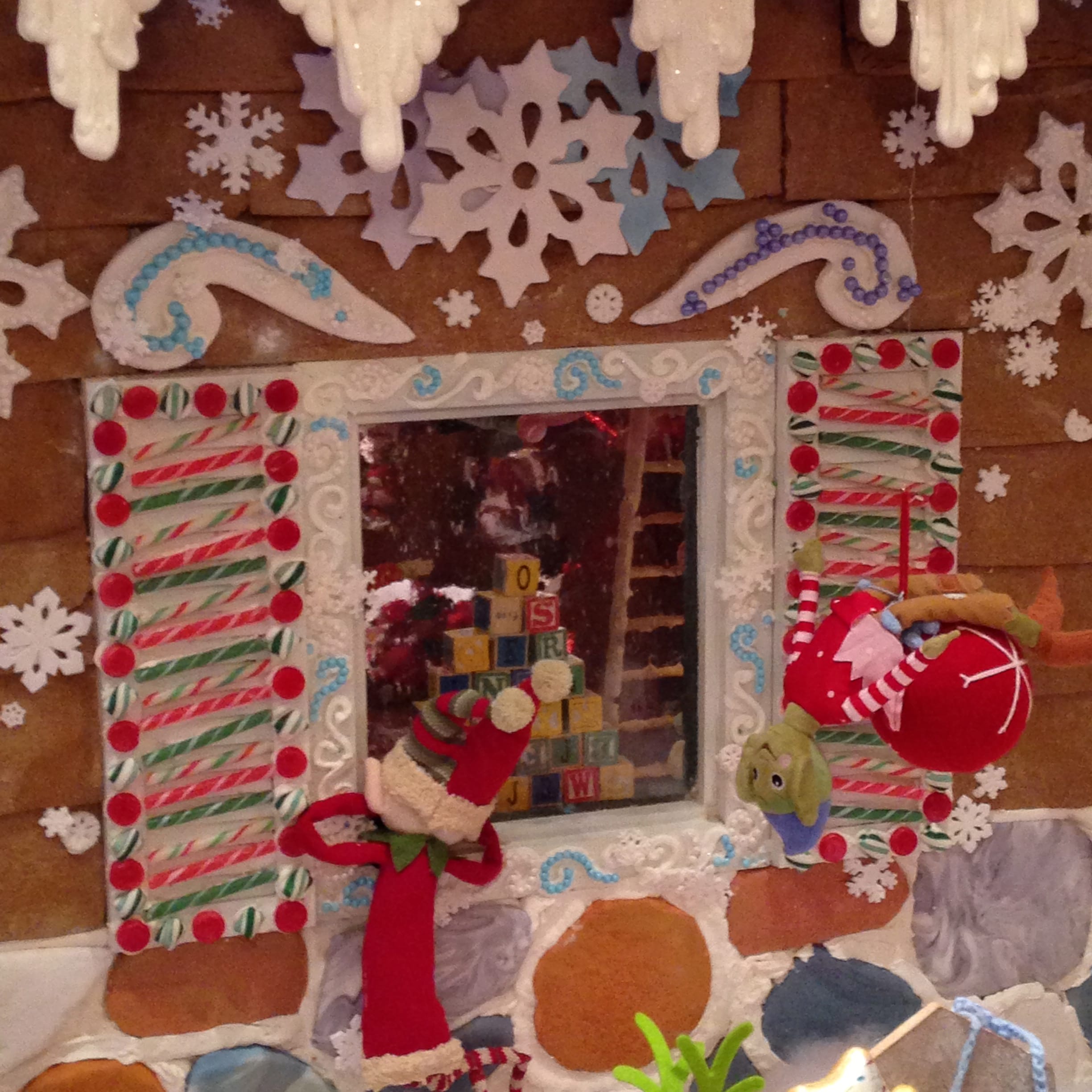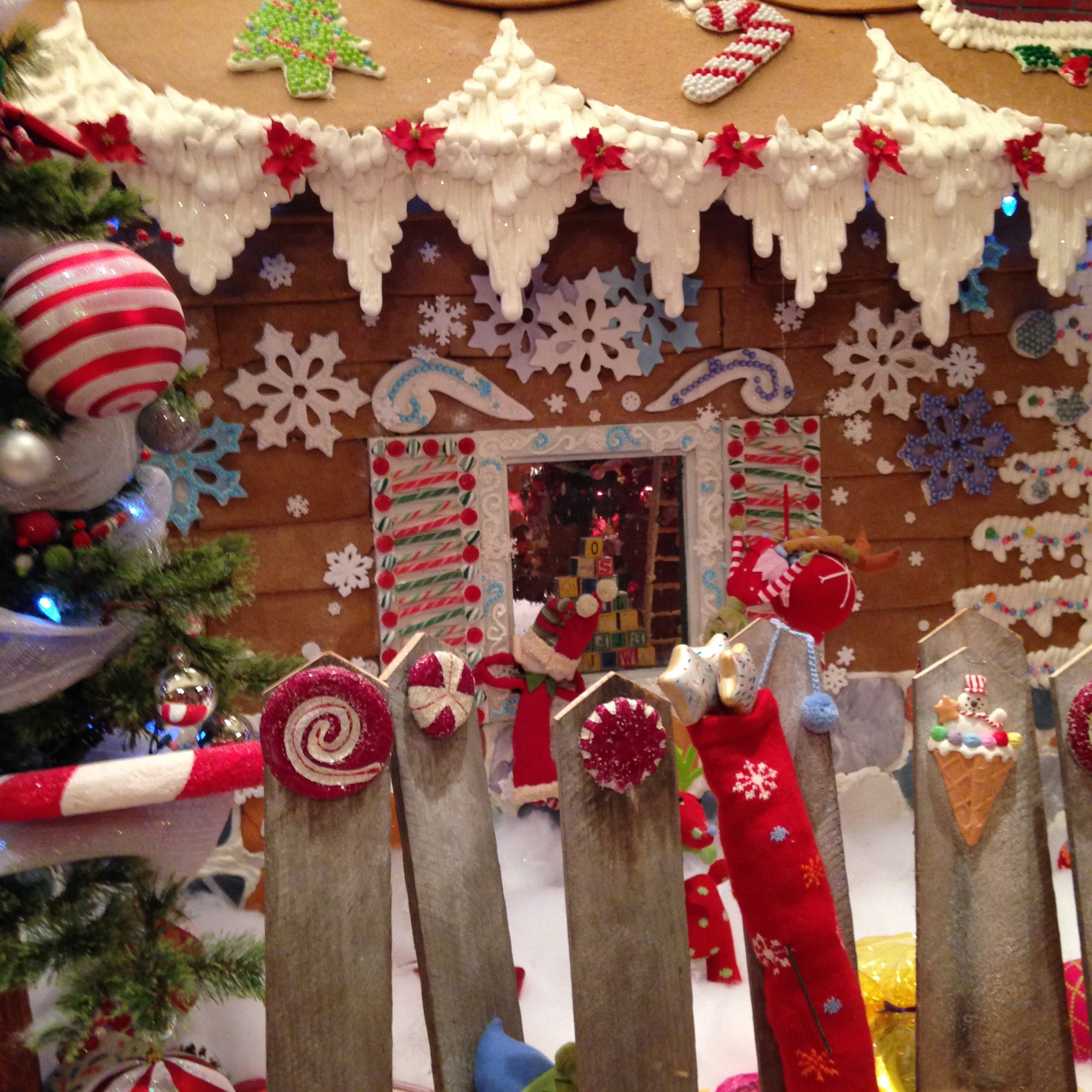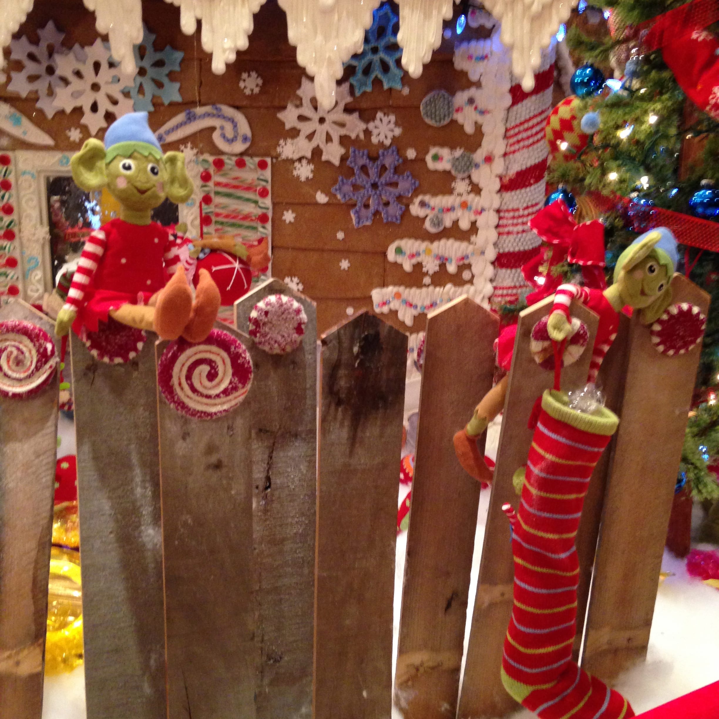 Inside the gingerbread house was a toy room with a beautiful tree and ornaments hanging from the top. Tiny elves are found in the fence, hanging in the toy room & looking in the window.
