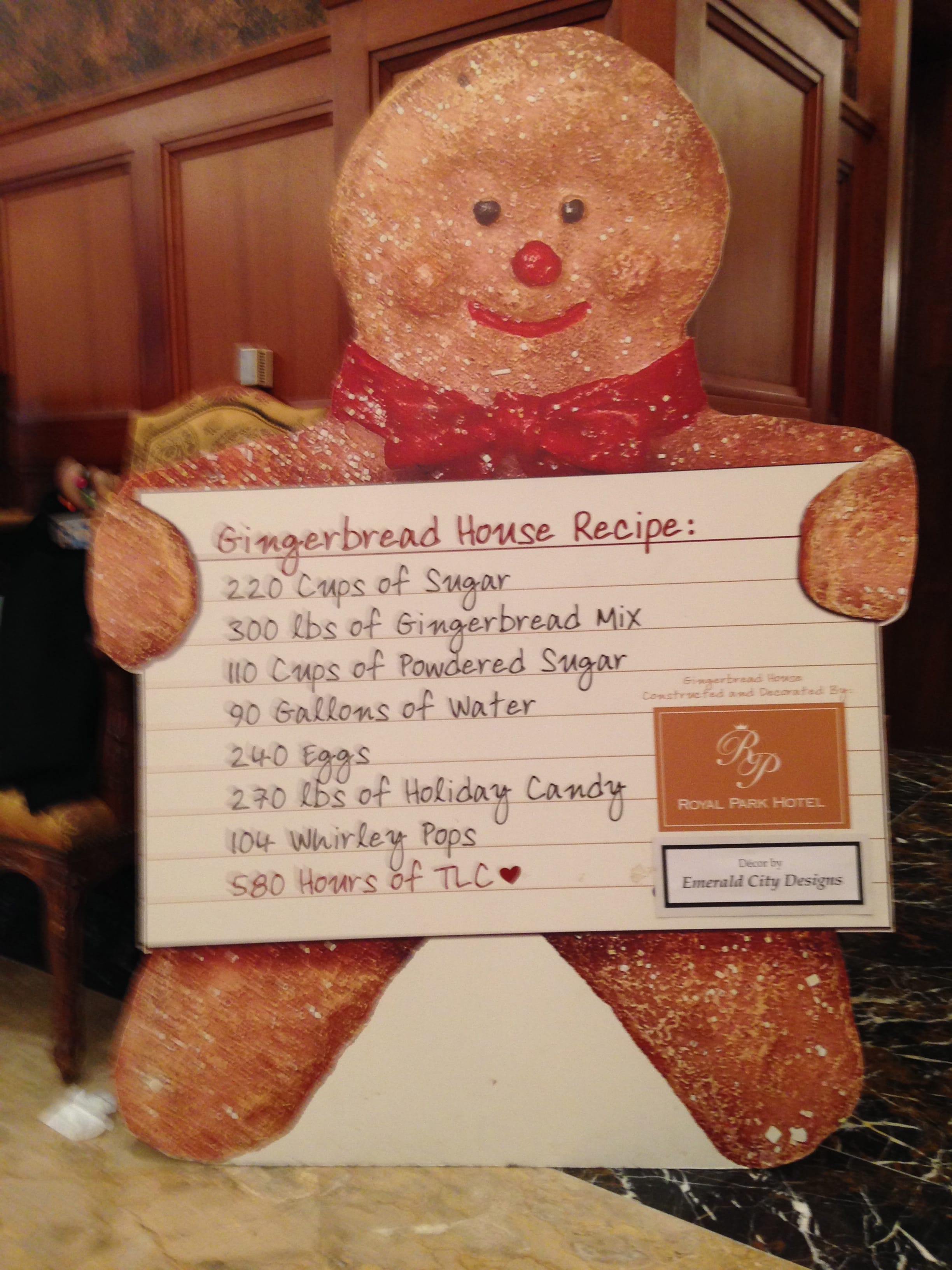 You can visit the giant gingerbread house in the lobby of The Royal Park Hotel any time now through January 5, 2013. The hotel lobby smells absolutely wonderful!